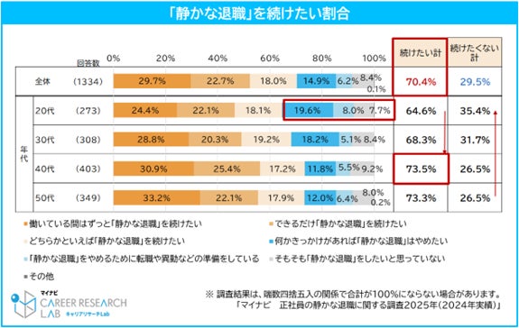 正社員の4割以上が「静かな退職※」をしており、20代が46.7%で最多。「静かな退職」をしている人の7割以上は「今後も静かな退職を続けたい」。中途採用担当者の約4割が「静かな退職」に賛成