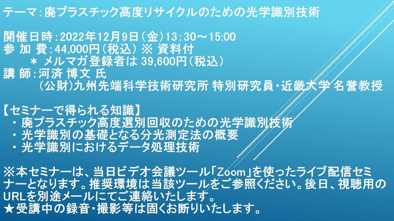 先端技術情報や市場情報を提供している(株)シーエムシー・リサーチ(千代田区神田錦町: https://cmcre.com/ )では、 各種材料・化学品などの市場動向・技術動向のセミナーや書籍発行を行っておりますが、 このたび「廃プラスチック高度リサイクルのための光学識別技術」と題するセミナーを、 講師に河済 博文 氏 (公財)九州先端科学技術研究所 特別研究員・近畿大学 名誉教授)をお迎えし、2022年12月9日(金)13:30より、 ZOOMを利用したライブ配信で開催いたします。 受講料は、 一般:44,000円(税込)、 弊社メルマガ会員:39,600円(税込)となっております(資料付)。