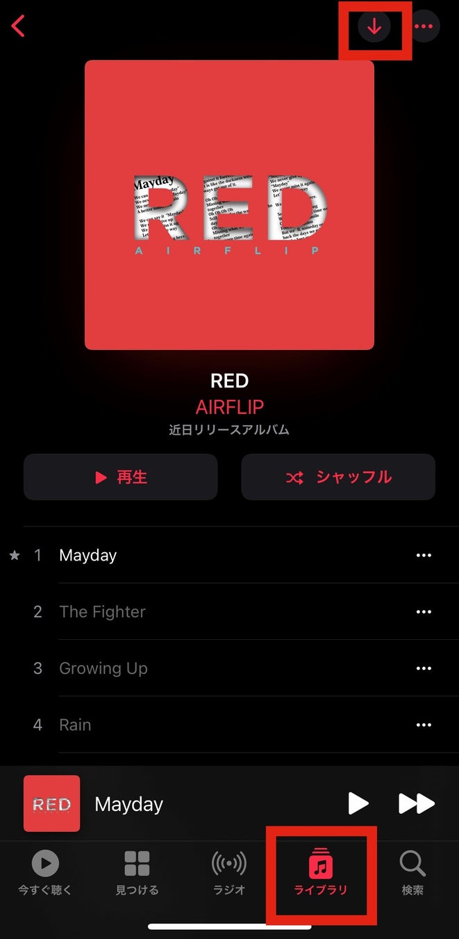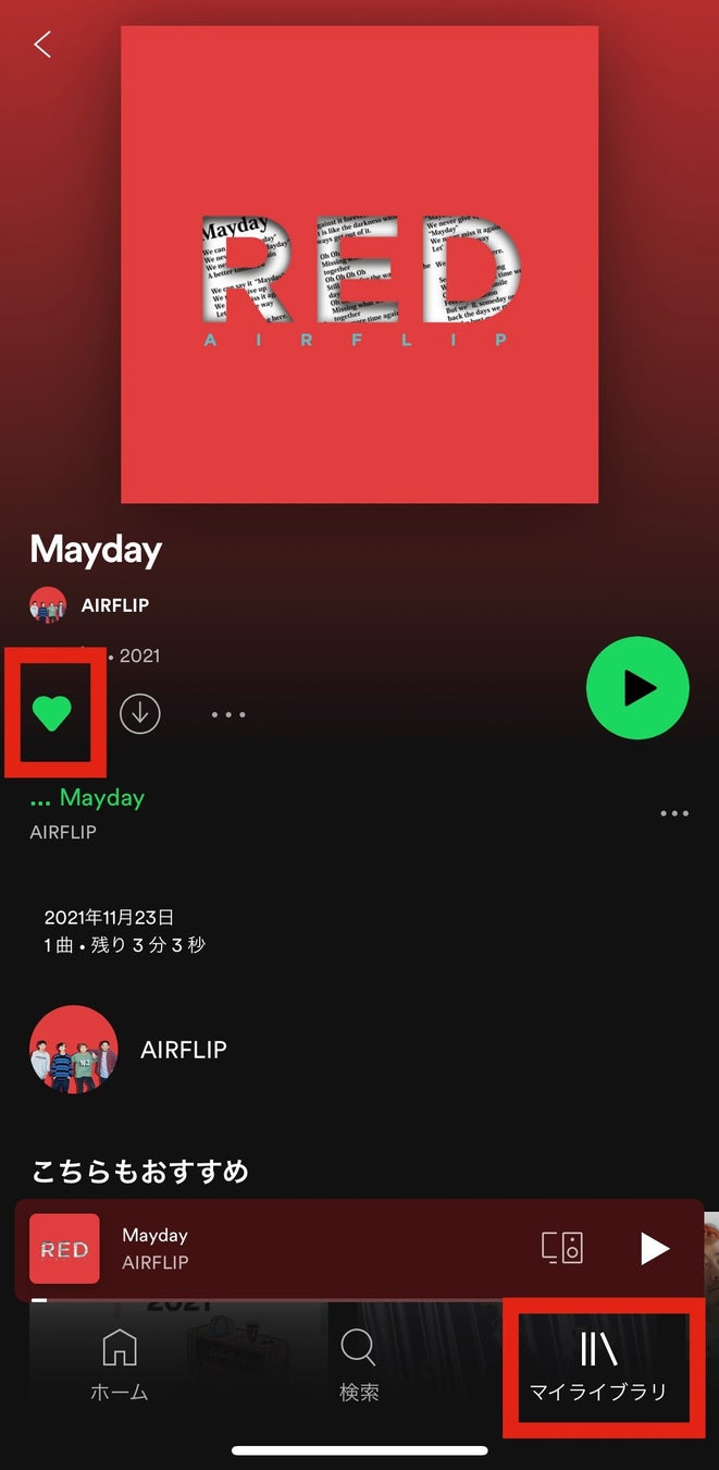 (1) Apple Musicの「RED」のページから、「+追加」ボタンを押し、ライブラリに追加する。もしくは、Spotifyの「RED」のページから、「♡」ボタンを押し、アルバムをMy Libraryに追加する。