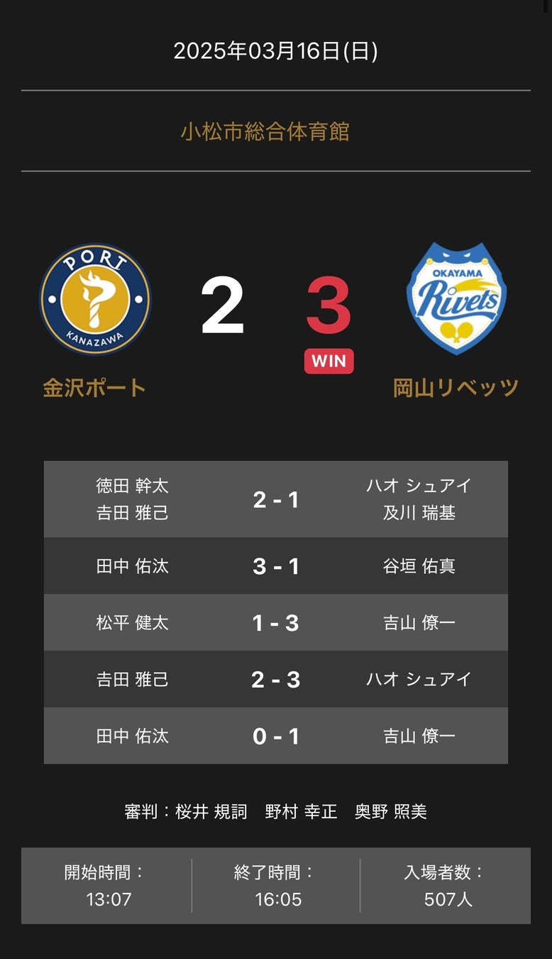 ノジマTリーグ 2024-2025シーズン 公式戦 3月16日開催 「金沢ポート vs 岡山リベッツ」の試合は、3-2で岡山リベッツが勝利しました。