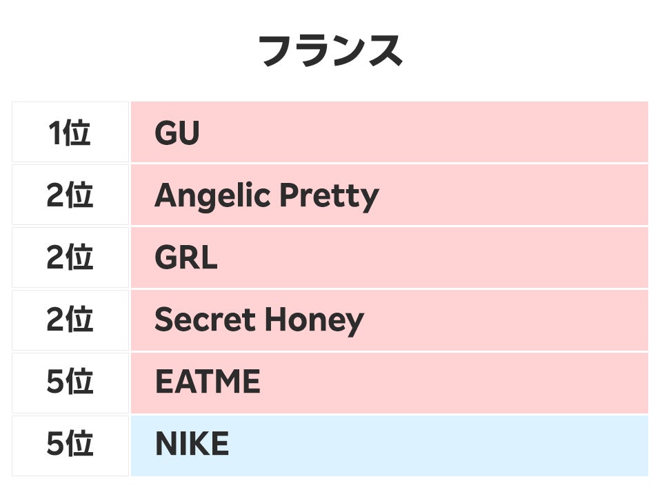 フランスでは、1位が「GU」、2位が「Angelic Pretty」「GRL」「Secret Honey」、そして5位が「EATME」および「NIKE」と、ランキング全体を通して日本の「Kawaii文化」(注)を象徴するブランドが多い結果となりました。