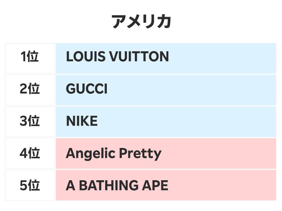 アメリカでは、1位が「LOUIS VUITTON」、2位が「GUCCI」とラグジュアリーブランドが続き、3位に自国発祥ブランドの「NIKE」、4位が日本のブランドである「Angelic Pretty」、5位にも日本のブランド「A BATHING APE」がランクインするという結果になりました。1位の「LOUIS VUITTON」は、レディースバッグを中心に多く取引されています。