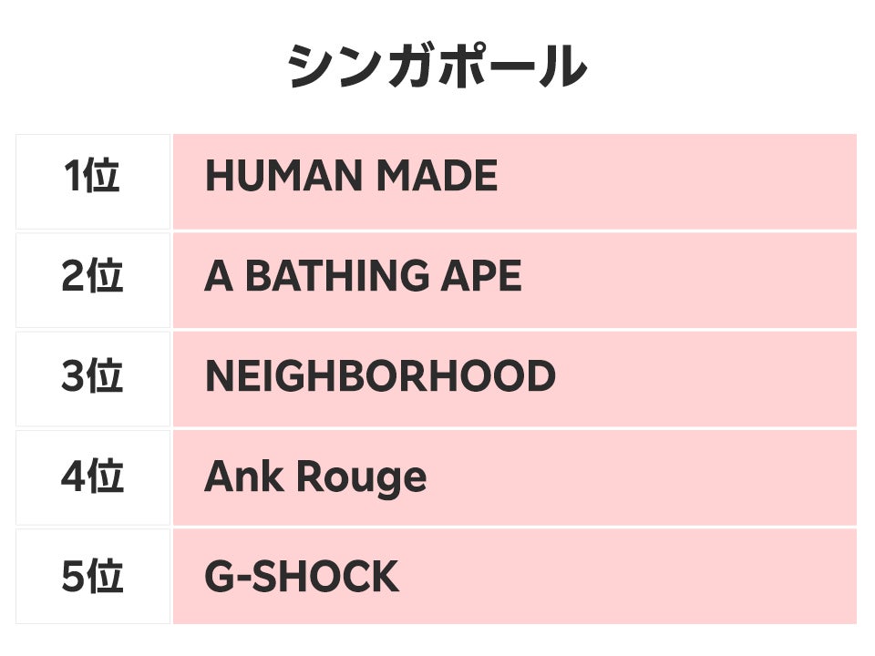 シンガポールでは、1位が「HUMAN MADE」、2位が「A BATHING APE」、3位が「NEIGHBORHOOD」、4位が「Ank Rouge」、5位が「G-SHOCK」と、今回の調査で唯一、5位までがすべて日本のブランドでした。