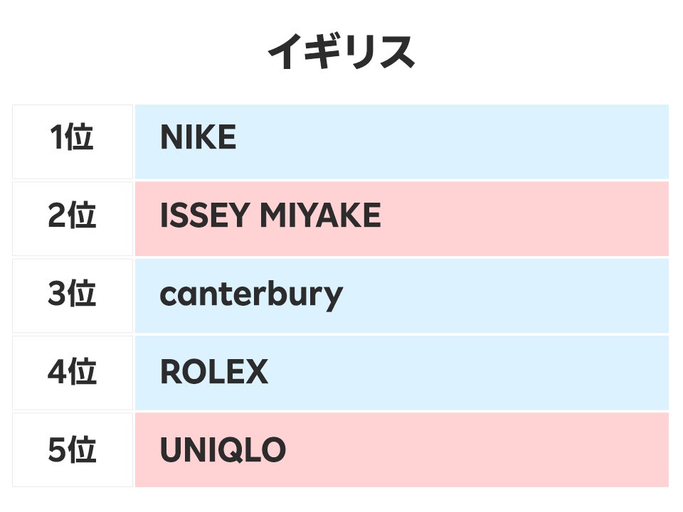 イギリスでは、1位が「NIKE」、2位が「ISSEY MIYAKE」、3位に「canterbury」、4位が自国発祥ブランドである「ROLEX」、そして5位には日本を代表するファストファッションブランドの「UNIQLO」がランクインしました。