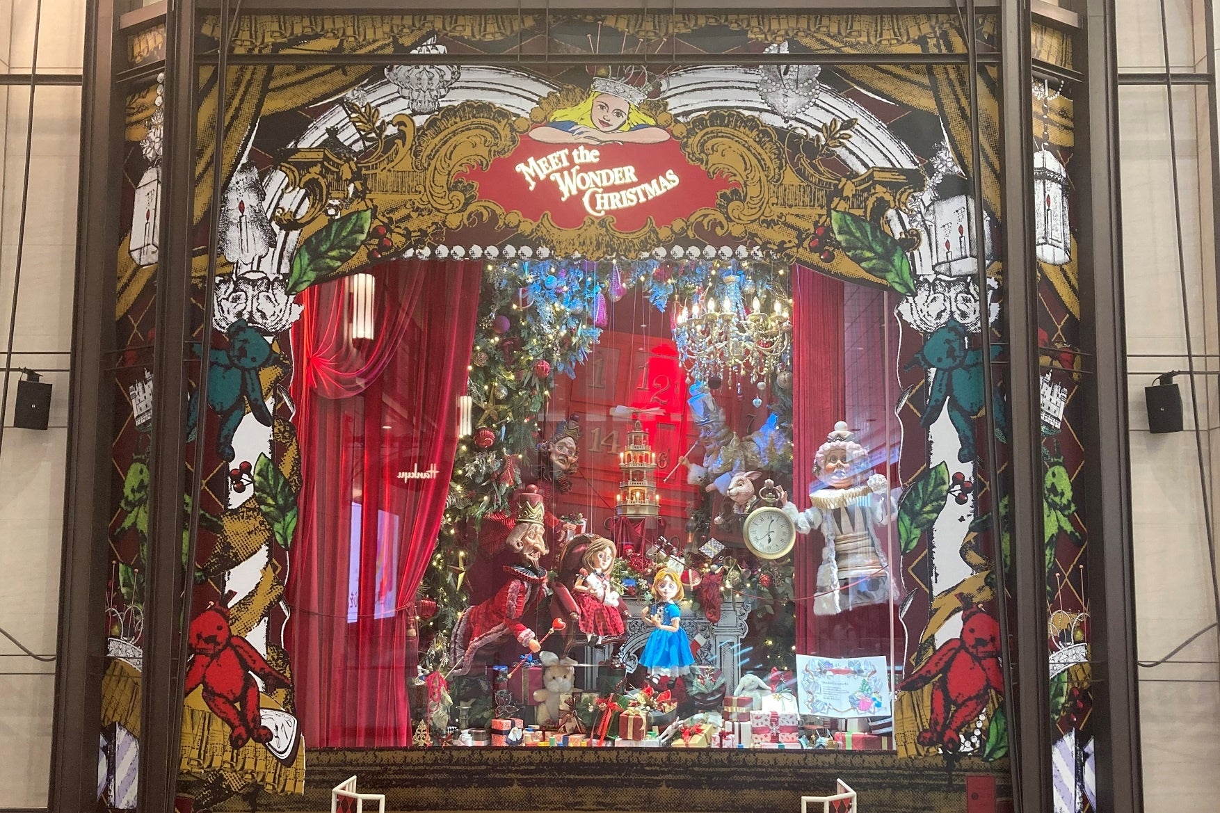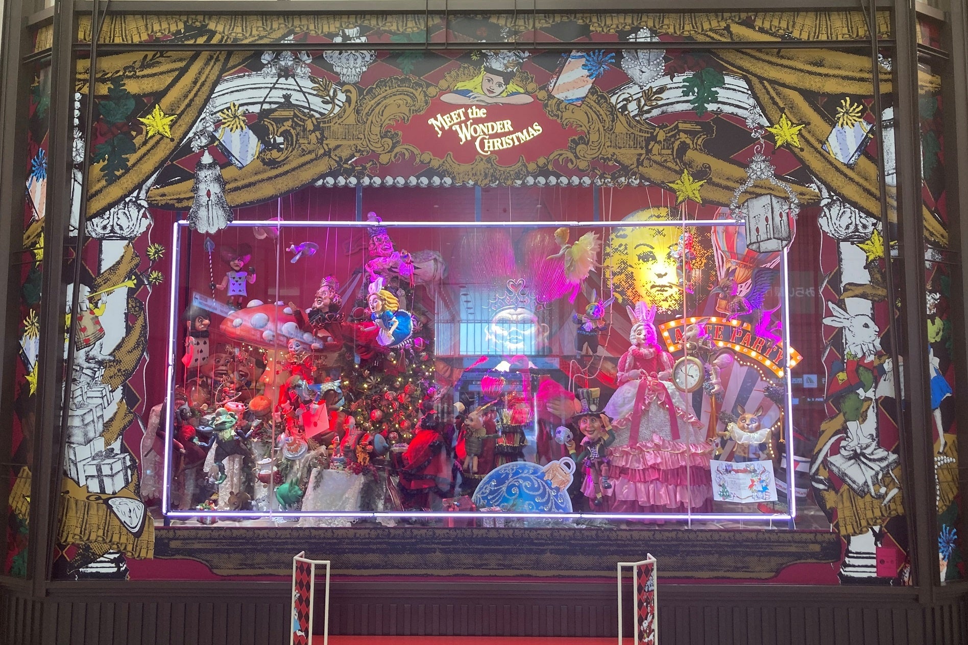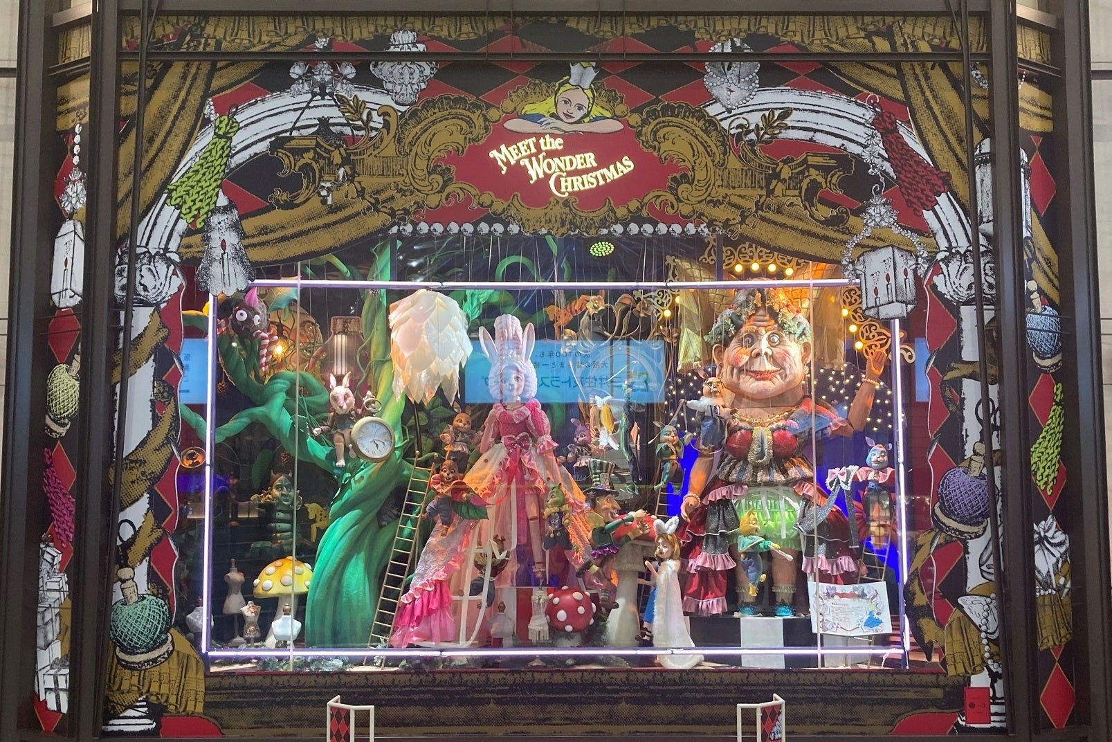 アリスが白うさぎさんに連れられてロリーナお姉さまのプレゼントを見つけるために迷い込んだ不思議の国。まるで遊園地のような世界で、プレゼント工場や舞踏会やパーティーなど、クリスマスを楽しむ様子を7つの場面で表現します。大人もこどもも魅了される、阪急うめだ本店の名物であるコンコースウィンドーは、今年もワクワク・ドキドキするクリスマスをお楽しみいただけます。また、3・4・6階では、マリオネットのミニシアターも登場します。