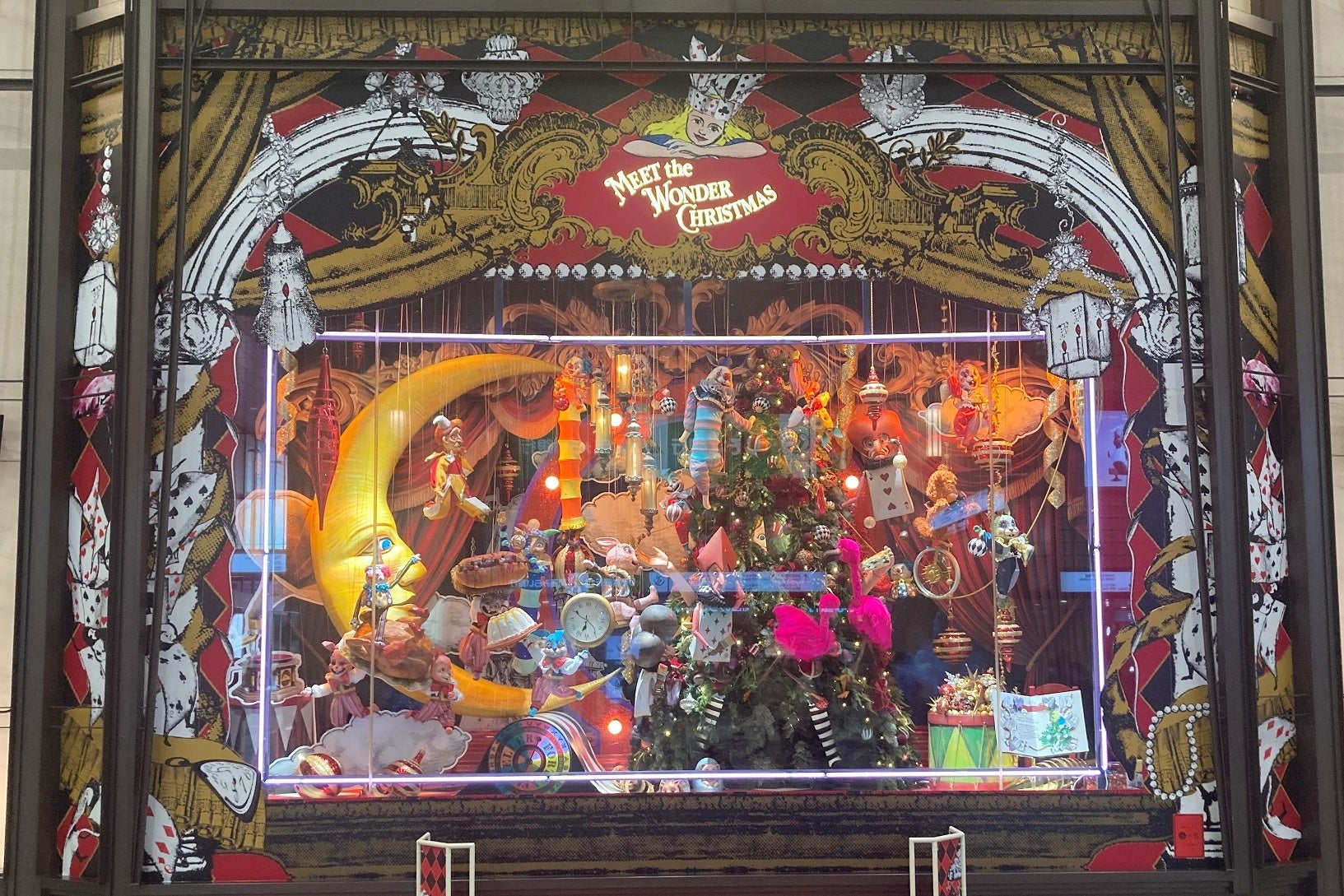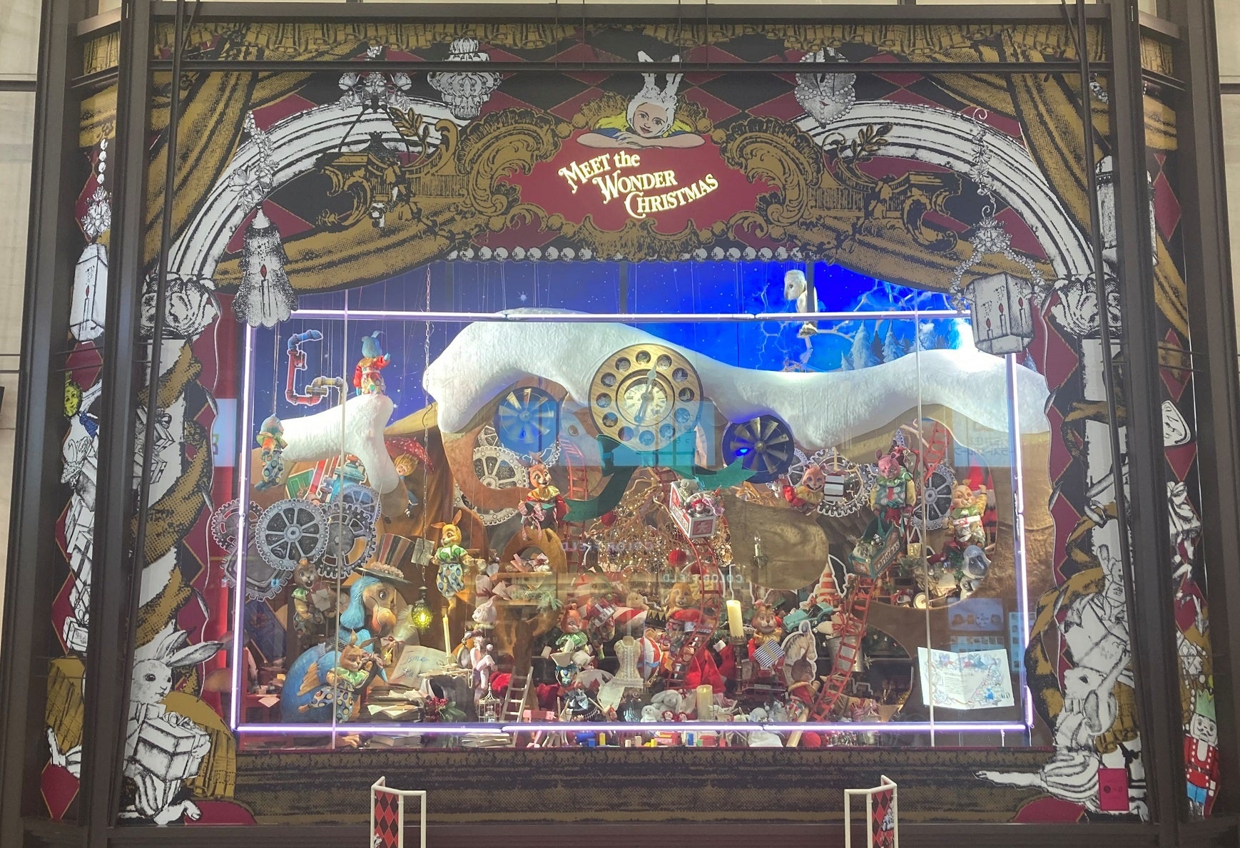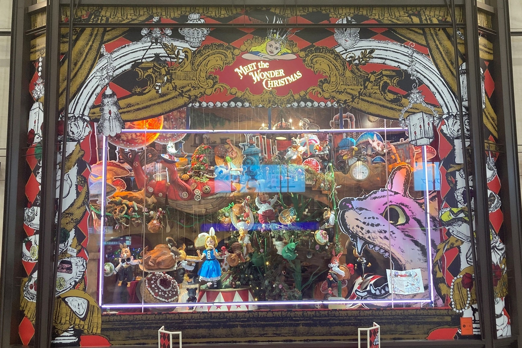 アリスが白うさぎさんに連れられてロリーナお姉さまのプレゼントを見つけるために迷い込んだ不思議の国。まるで遊園地のような世界で、プレゼント工場や舞踏会やパーティーなど、クリスマスを楽しむ様子を7つの場面で表現します。大人もこどもも魅了される、阪急うめだ本店の名物であるコンコースウィンドーは、今年もワクワク・ドキドキするクリスマスをお楽しみいただけます。また、3・4・6階では、マリオネットのミニシアターも登場します。
