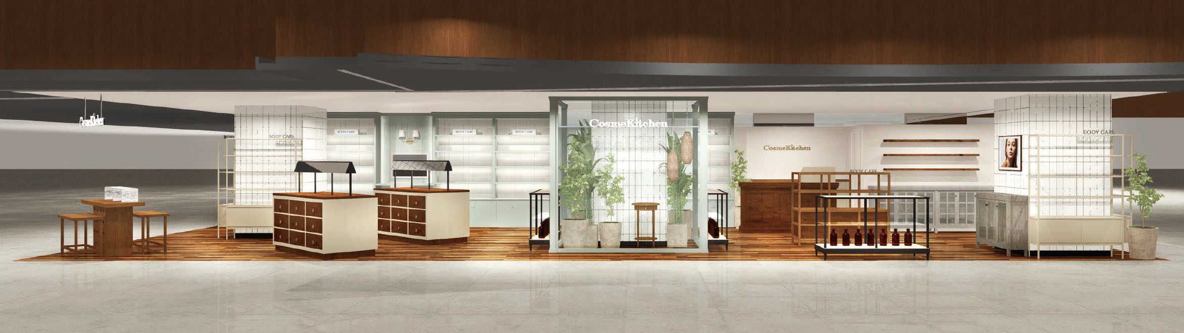 コスメキッチンのコンセプトを表現するような、淡いグリーンや白いタイルを使い、中央にショーウィンドウを配置した店内は、開放的であらゆるライフスタイルにマッチし、おひとりではもちろん、大切な家族や、友人、恋人と。様々なシーンで、お買い物をお楽しみいただけます。