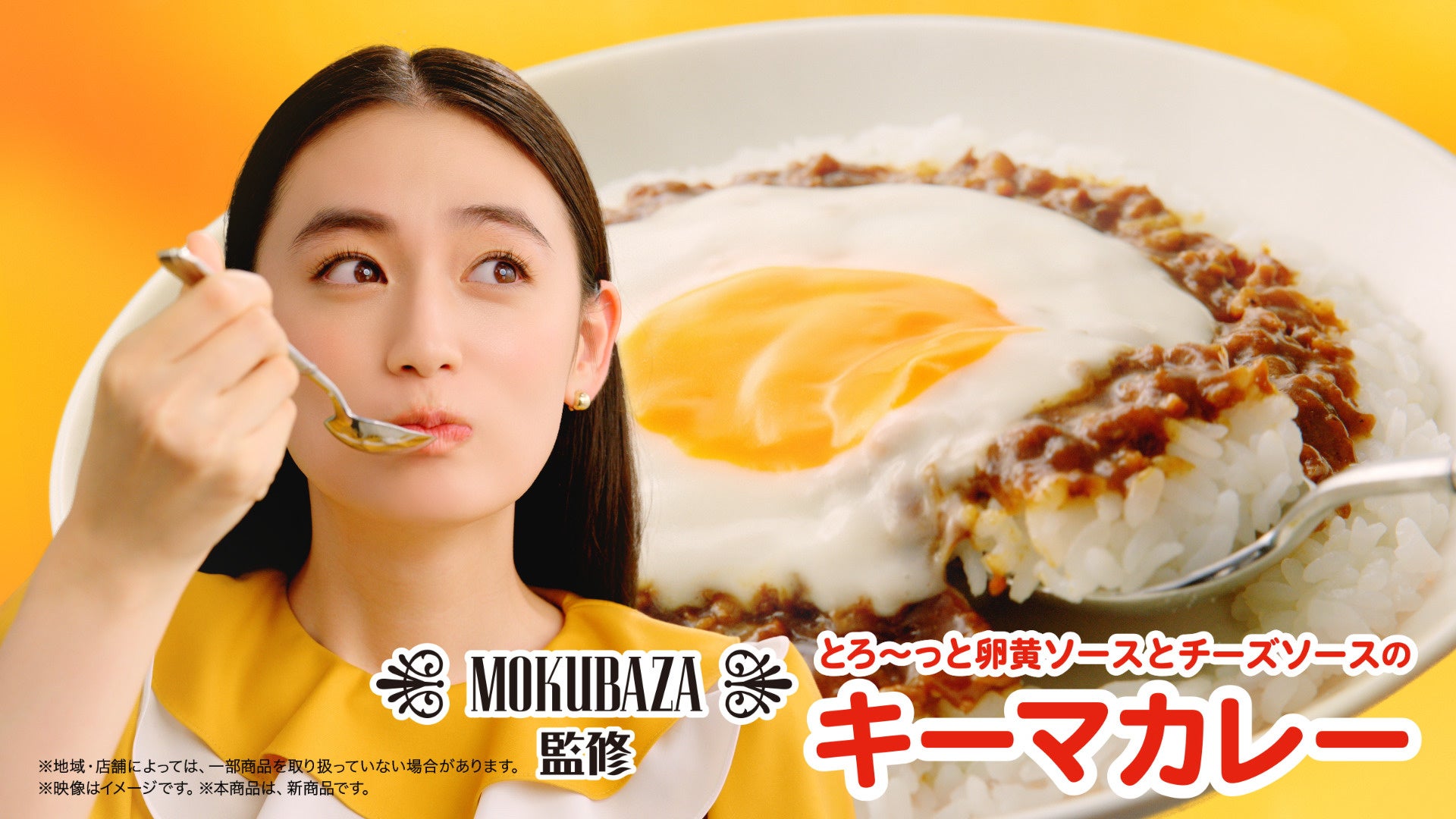 新TVCM「絶品登場!ふわっとろ〜たまご弁当」篇では、“ピキピキ…パカン!”と大きなたまごの殻が割れ、光の中からふわっと八木莉可子さんが登場します。八木さんは手で“たまごポーズ”をつくりながら、「大阪王将監修ふわっとたまごの天津炒飯」「MOKUBAZA監修とろ〜っと卵黄ソースとチーズソースのキーマカレー」の2つの“ふわっとろ〜”メニューを試食。