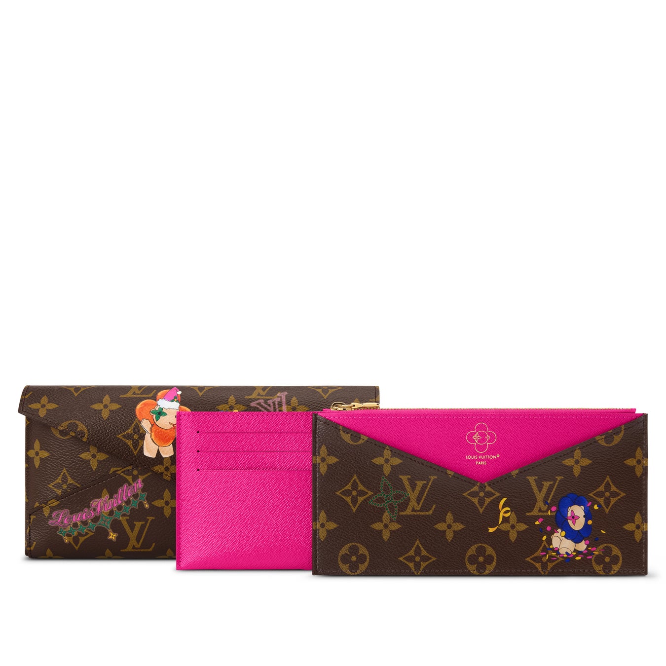 「キリガミ·オーガナイザー」は、大小3つのデザインが入れ子状に収められています。メゾンのマスコットを鮮やかなカラーで表現。ライニングとトリミングにはフローズンオーキッドカラーのレザーを施し、上品なゴールドカラーの金具で仕上げました。