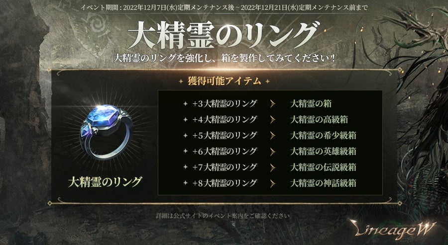 強化段階に応じて豪華報酬が獲得可能な「大精霊の箱」を製作できる「大精霊のリング」イベントが開始しました。