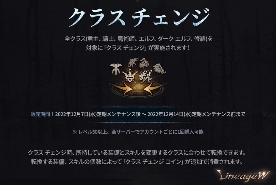 今回の全クラス対象の「クラス チェンジ」は、レベル50以上のキャラクターが対象となります。