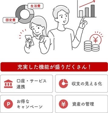 また本サービスでは、水道・光熱費、通信費などの固定費や、食費、日用品費などの変動費の支出を項目ごとに自動で分類し、家計全体の収支をひと目でわかるように表示します。家計全体の支出を固定費と変動費に分けて可視化することで、必要以上の出費を抑えて効果的な資産管理を実現し、家計改善に貢献することを目指します。その他にも、普段の生活に役立つ節約術など家計管理のためのコンテンツや、ユーザーの志向に合わせた、楽天の様々なサービスに関するお得なキャンペーン情報を掲載します。