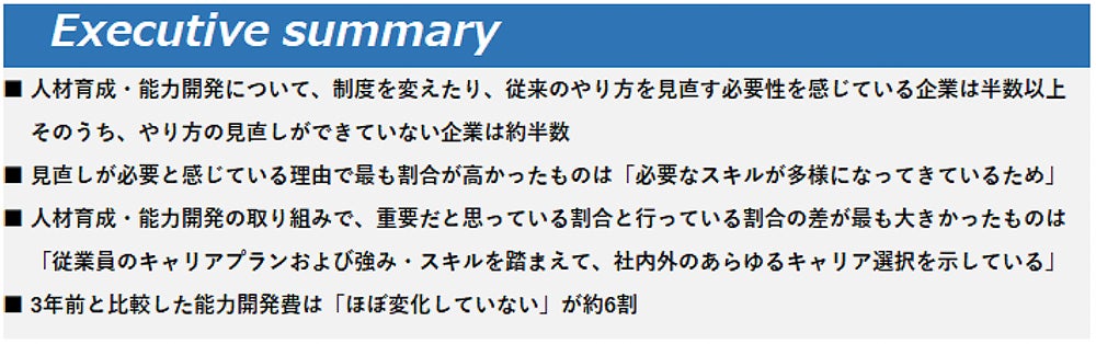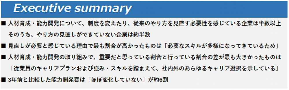人材育成・能力開発について見直しの必要性を感じていながら、実施に至っていないという企業が多数であるという問題が浮き彫りとなっています。