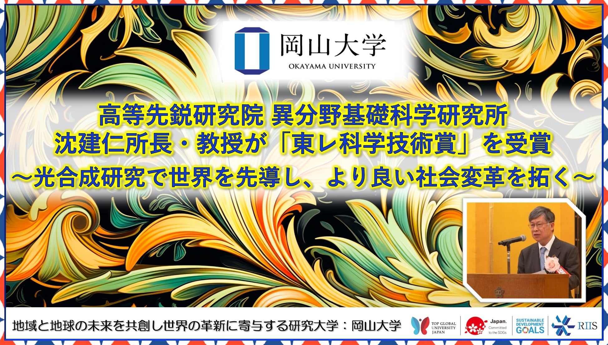 今回の受賞について本学の那須保友学長は、「長い歴史と我が国の科学技術振興において重要な役割を担ってきた公益財団法人東レ科学振興会の『東レ科学技術賞』を沈所長・教授が受賞したこと、本学を代表して厚く御礼申し上げます。本学は、岡山大学長期ビジョン2050『地域と地球の未来を共創し、世界の革新に寄与する研究大学』の実現に向け、さらに昨年に採択を受けた文部科学省『地域中核・特色ある研究大学強化促進事業(J-PEAKS)』(実施主体:日本学術振興会)の取り組み等において、より良い社会変革を実現するための研究・イノベーション活動を戦略的に推進しています。これらの取り組みにおいて、沈所長・教授の光合成の基礎研究とその先にある人工光合成は、まさに私たちの生活を一変する社会変革のひとつです。今回の受賞がさらなる研究活動の弾みとなるよう、本学も引き続き全力で沈所長・教授らの活動をバックアップし続けていきます」とコメントしました。
