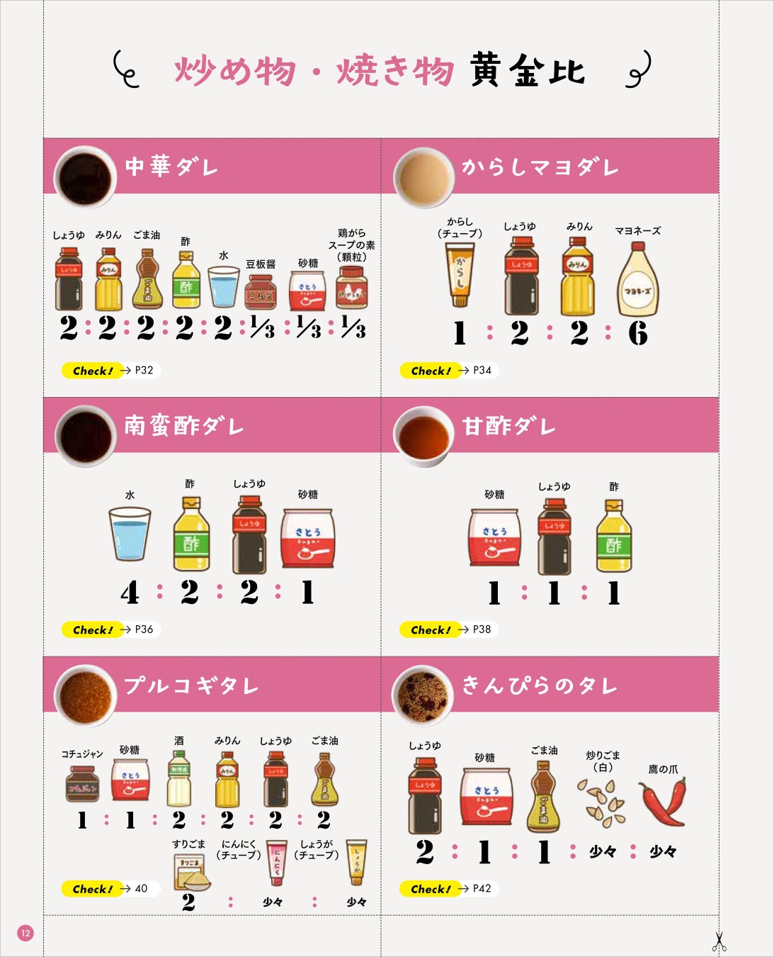 巻頭には、うなさん考案の「調味料の黄金比」47種類のリストを、切り取って使えるカード仕様で収録。冷蔵庫に貼ったり、カードリングでまとめてキッチン周りに置いておけば、料理中にササッと見ることができます。誌面では、この47種類のタレ・つゆ・ソースを使った炒め物や副菜、パスタなどのレシピを102品収録。各レシピのページにも、使う調味料の黄金比が一目でわかるイラストが入っており、使いやすさにこだわった一冊です。