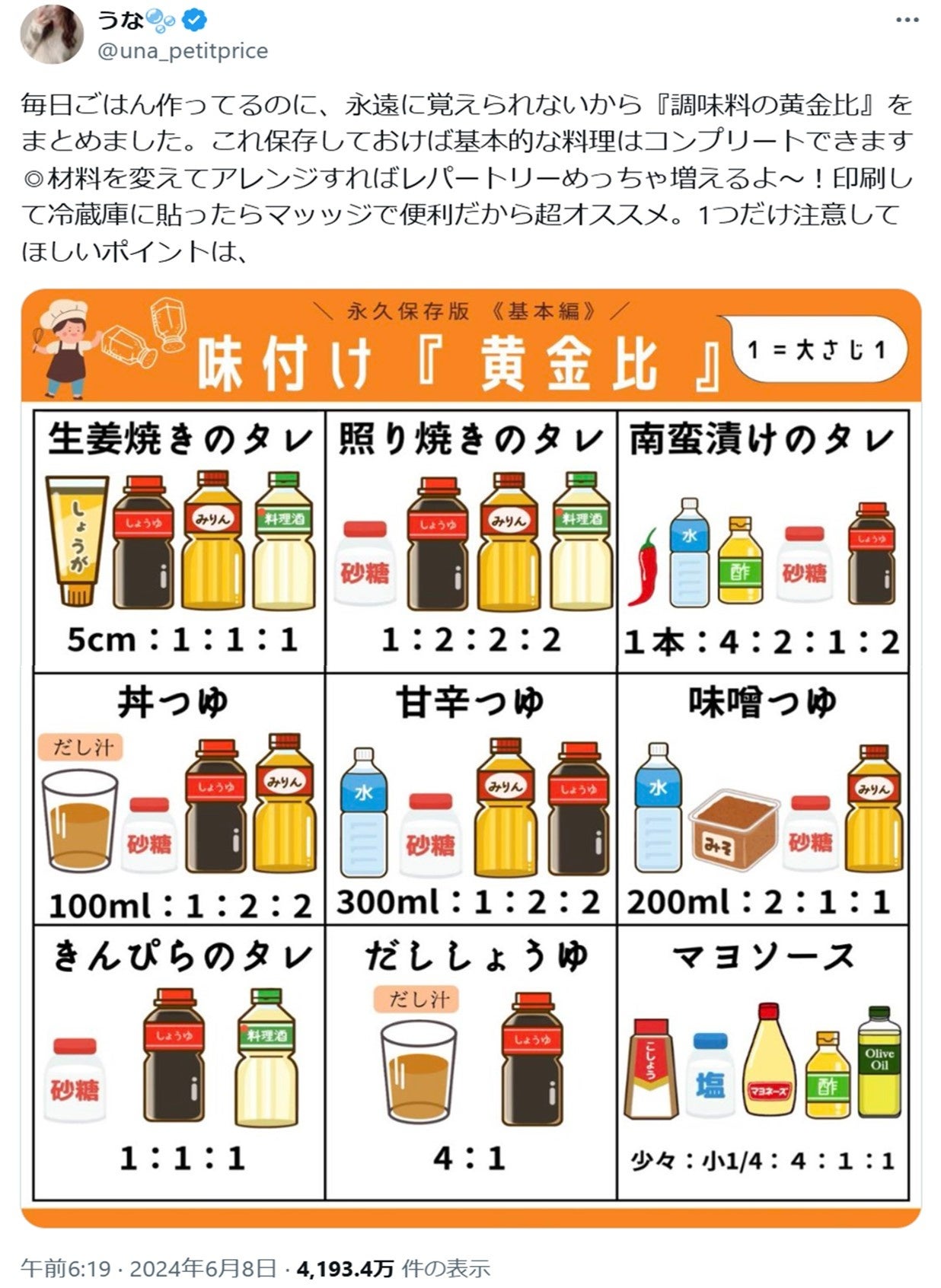 広島県出身、広島県在住。美容と服と食べることが好きな2児の母。日々の料理を簡単にするために考案した調味料の黄金比をXに投稿し、4000万インプレッションを獲得するなど大きな話題に。黄金比を使ったレシピも投稿している。@una_petitprice