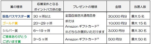 ラリーした「ポイントバス停」の数に応じ、プレゼントの種類・金額が以下のとおり変わります。