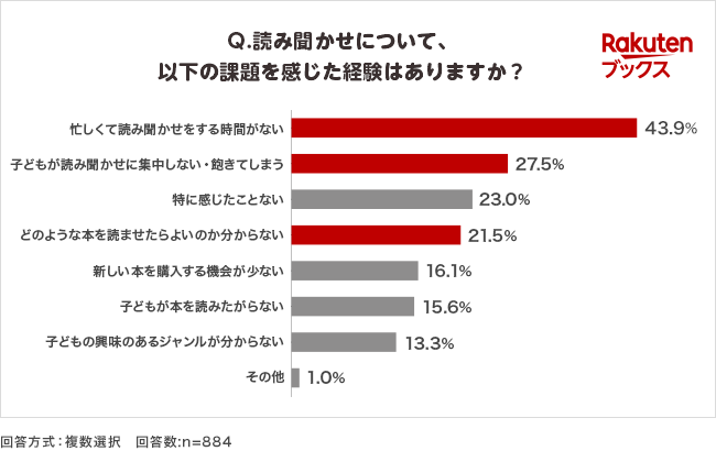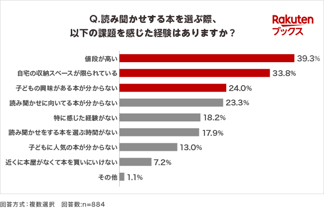 絵本を選ぶ際に感じたことのある課題については、「値段が高い」(39.3%)、「自宅の収納スペースが限られている」(33.8%)といった課題に次いで、「子どもが興味のある本がわからない」(24.0%)という結果となりました(図3)。「楽天ブックス」では、このような読み聞かせに対する課題を持ったママ・パパに対してより親子での読み聞かせを楽しんでもらいたいという思いから、今回の特集ページの公開に至りました。