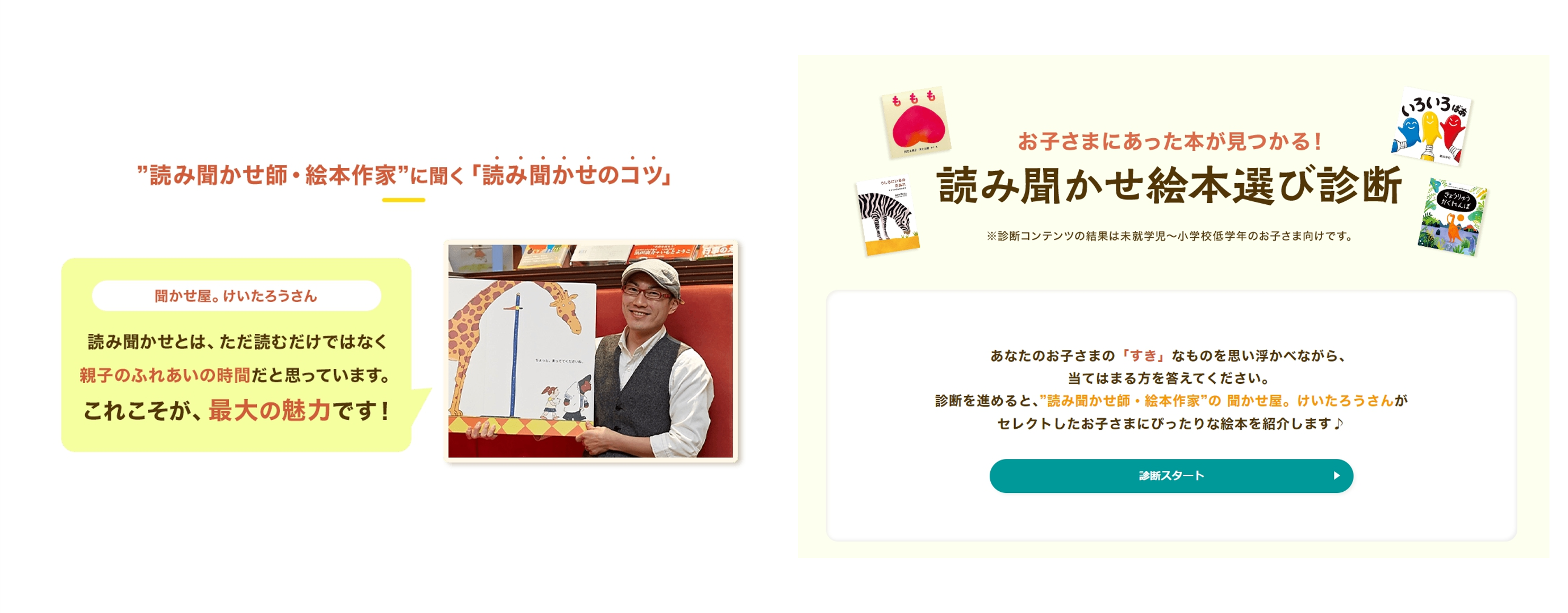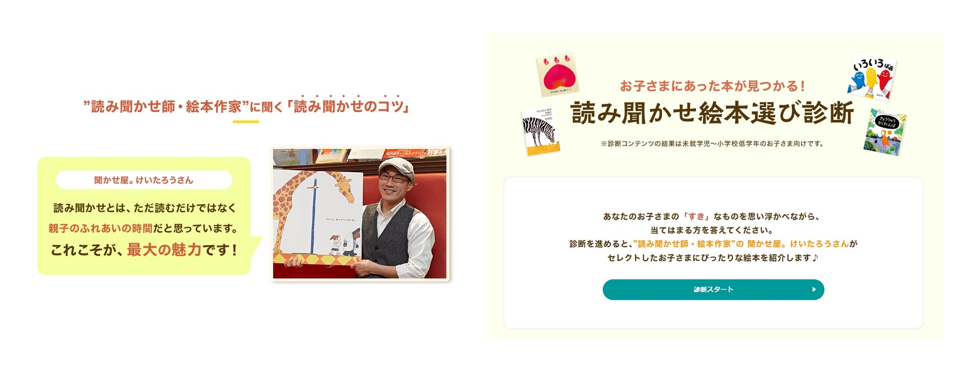 本日公開した特集ページでは、読み聞かせ師であり自身で絵本の執筆を行う聞かせ屋。けいたろう氏が、絵本の読み聞かせに対して課題を感じているママ・パパを対象に読み聞かせのコツを紹介するコンテンツや、子どもの興味・関心に合った絵本がわかる「読み聞かせ絵本選び診断」を展開します。「読み聞かせ絵本選び診断」では、選択肢の中から子どもの好きなものを選び進めると、興味・関心別に同氏がセレクトした読み聞かせ絵本が結果に表示されます。