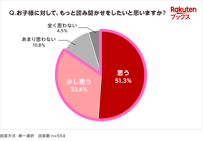 本特集に先立ち、妊娠中や育児中のママ・パパを対象とした無料のメンバーシッププログラム「楽天ママ割」メンバーを対象に、「絵本の読み聞かせに関するアンケート」を実施しました。0歳~小学校低学年までの子どもがいると答えた方に「読み聞かせをもっと増やしたいと思うか」を質問したところ、合わせて8割以上が「そう思う」「少し思う」と回答し、読み聞かせに対するニーズの高さがうかがえました(図1)。