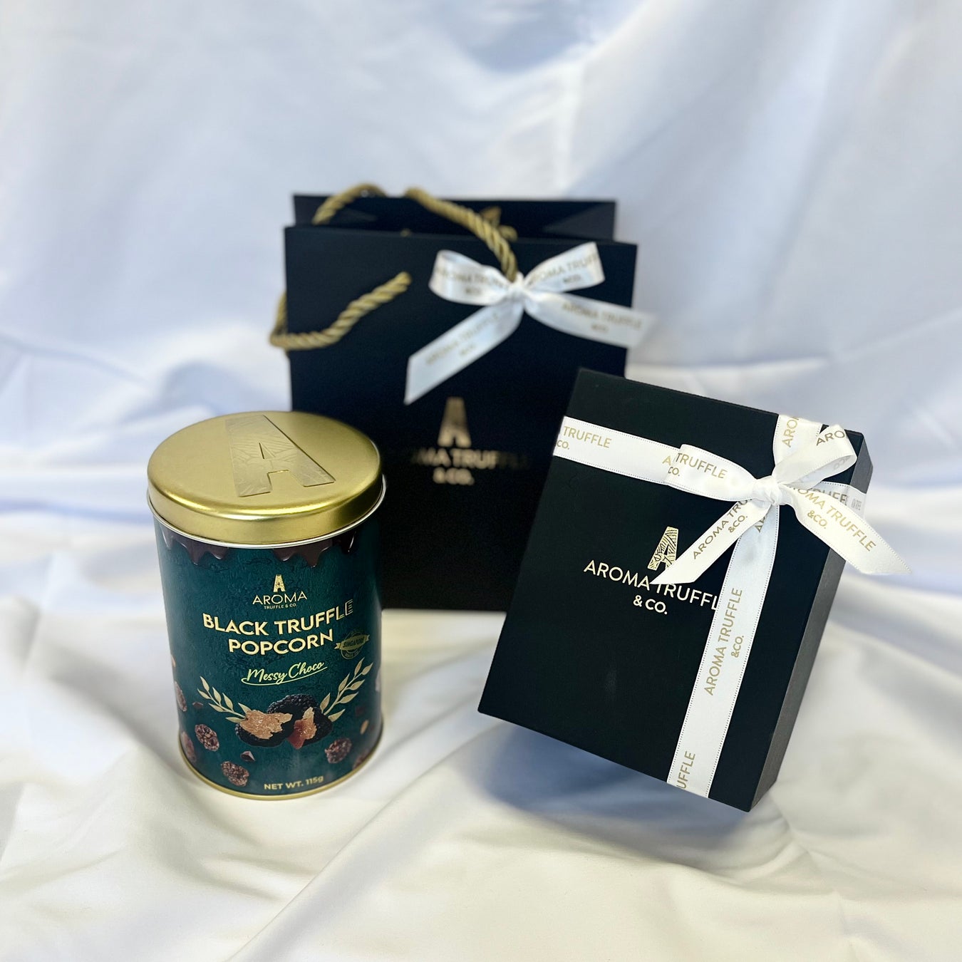 〈アロマトリュフ〉アロマトリュフポップコーン(ギフトボックス付)メッシーチョコ缶(115g) 3,790円/1階 MAP①