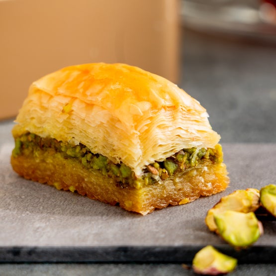 「バクラヴァ」とはパイ生地を何十層にも手作業で重ね、ピスタチオやくるみ、ヘーゼルナッツ等のナッツを挟みバターシロップをかけて焼き上げるオスマン帝国時代から愛されている焼き菓子です。トルコ・イスタンブールの本店と同じ味わいをお楽しみいただけます。常温でお日持ちもするので、珍しい特別な手土産としてもおすすめです。