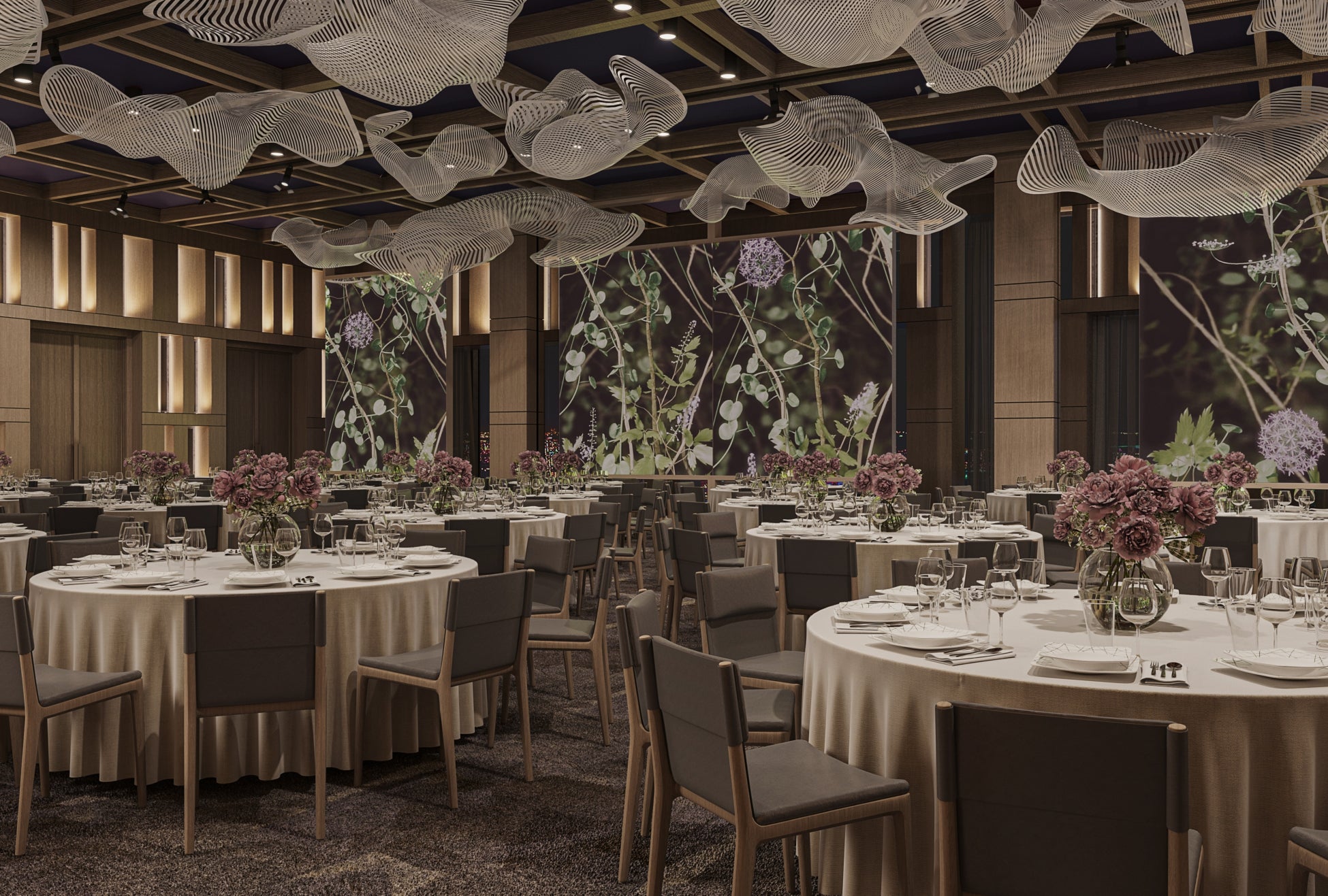 花と緑のフローラルアートは、JWマリオットならではの豊かな自然の息吹を取り入れ、会場全体を優美かつダイナミックに演出します。季節感を大切にした選りすぐりの花々が、空間のスケールに合わせて壮大かつ繊細に配され、洗練された空気感を醸成します。エレガントでモダンなテーブルセッティングは、細部にまでこだわったデザインとクオリティで、場全体に統一感と格調高い雰囲気をもたらします。テーブルクロスからカトラリー、グラスウェアまで、一貫したコンセプトのもとに選ばれた上質なアイテムが、おふたりの想いを形にし、美しさと温もりが隅々にまで行き渡る、忘れられない空間を創り出します。