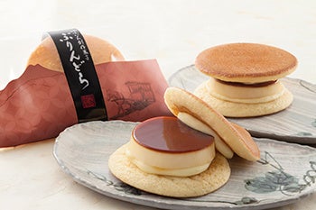 阿蘇小国のジャージー牛乳を使用し、ほろ苦いカラメルソースがアクセントのプリンを、ふんわりパンケーキ風のどら焼きで、カスタードクリームとあわせてサンドした新感覚のひんやりスイーツ。