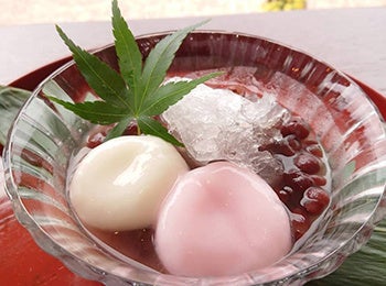 出雲産大納言小豆を使用し、冷たい小豆汁の上に削り氷と紅白のお餅がのった「冷やし出雲ぜんざい」。小豆が大粒なので、しっかりと小豆の味が感じられる一品。夏季限定で提供中。