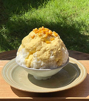 「嶽きみみるく氷」は、岩木山麓の嶽高原で収穫された糖度の高いとうもろこし“嶽きみ”を使用。青森の食材にこだわったかき氷を通年提供している、弘前公園すぐ横にあるカフェで、「嶽きみみるく氷」は収穫の時期のみ味わうことができる。