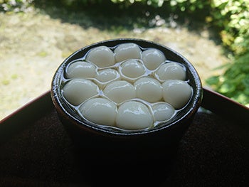 白玉粉で作った小さな団子を「島原の湧水」で冷やし、砂糖などで作った特製の蜜をかけたもの。島原名物の上品な甘さの和スイーツ。