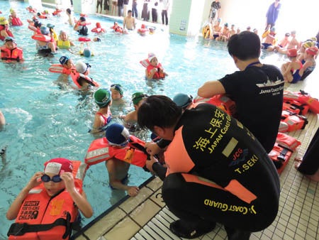 参加者は、実際に救命胴衣を着用し、落水することで救命胴衣の重要性について深く理解していました。また、ペットボトルを浮き具代わりにして救助を待つなど、実践さながらの練習をしたほか、潜水士や機動救難士による訓練の見学などを実施し、水難事故に遭った、あるいは事故現場に遭遇した際の知識や対処方法を学びました。