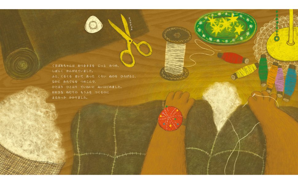 眠れないお月様のために、とっておきの眠りの毛布を作るくまばあちゃん。わたぐもを詰め込んで、ひとはりひとはり縫っていきます。くまばあちゃんの丁寧な手仕事がひかります。眠る前のリラックスタイムにゆっくりと読みたい一冊です。