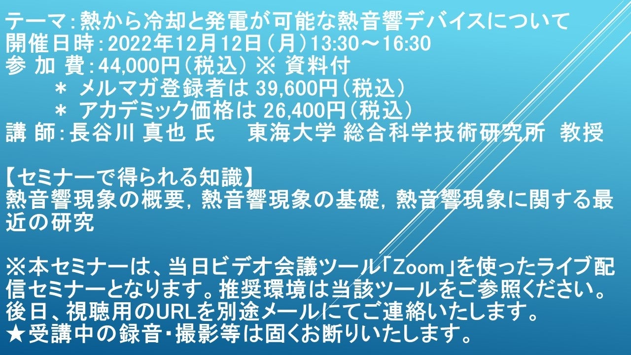 【ライブ配信セミナー】熱から冷却と発電が可能な熱音響デバイスについて 12月12日(月)開催 主催:(株)シーエムシー・リサーチ