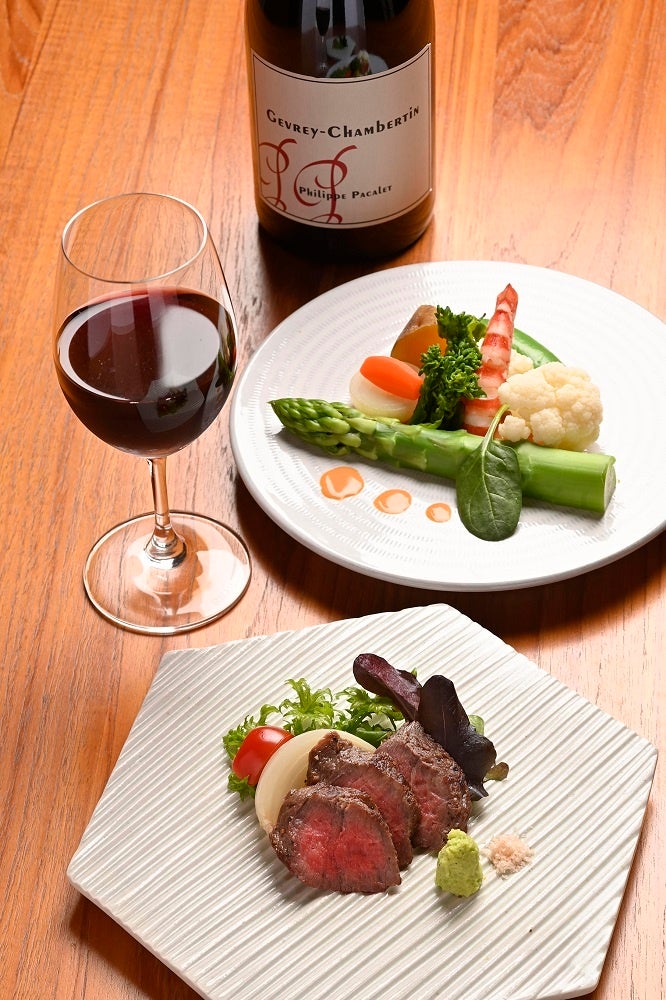 蓄音機の音色を聴きながらくつろげる宿・山荘わらび野(大分県由布市)で提供される夕食。手前から大分和牛のステーキ、地元野菜の前菜。