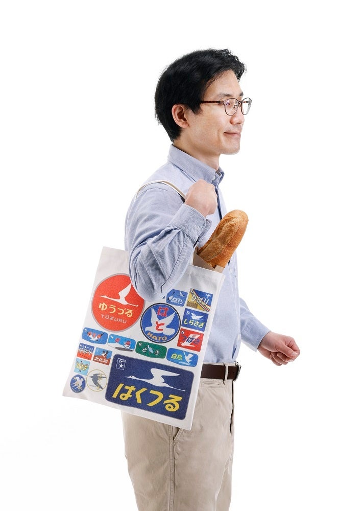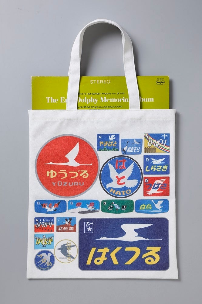 列車の愛称に使われた「ひばり」「ゆうづる」「つばさ」など17種類の鳥の名前のトレインマークを配したトートバッグです。