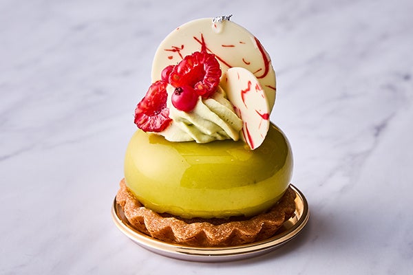 鮮やかな緑の艶感が目を引く、イタリア産のピスタチオムースの中に酸味の効いたフランボワーズのゼリーと、果実入りババロアが入った酸味と甘みのバランスが絶妙なケーキです。