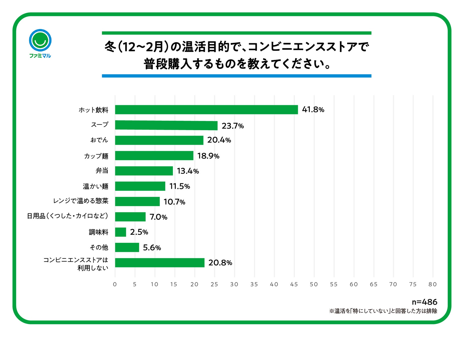 また、温活目的で購入するコンビニ商品を聞いたところ、1位「ホット飲料」41.8%、2位「スープ」23.7%、3位「おでん」20.4%となり、コンビニで購入できる手軽さも重要なポイントとなります。
