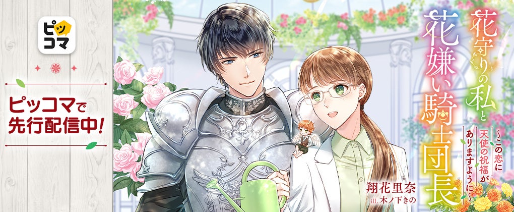 メイプルノベルズ刊『花守りの私と花嫌い騎士団長~この恋に天使の祝福がありますように~』が、「ピッコマ」にて先行配信スタート!