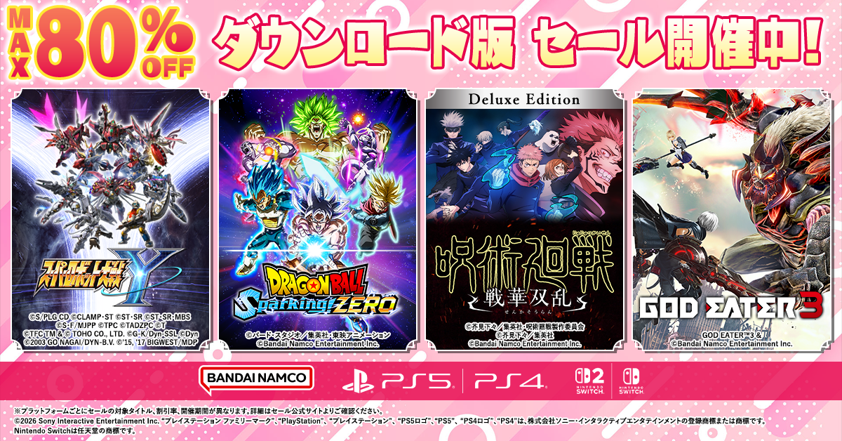 株式会社バンダイナムコエンターテインメントは、ダウンロード版ゲームをお得に購入可能なセールの開催をお知らせいたします。『スーパーロボット大戦Y デジタルアルティメットエディション』や『ドラゴンボール Sparking! ZERO』など、人気タイトルが最大80%OFFの特別価格でお楽しみいただける期間限定のセールです。