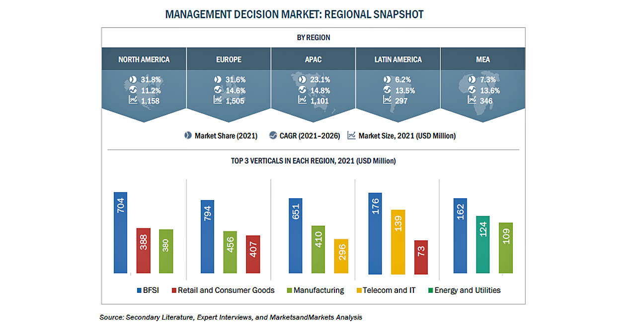 経営上の意思決定管理の市場規模は、2021年の48億米ドルからCAGR13.5%で成長し、2026年には90億米ドルに達すると予測されています。市場の成長は、意思決定の質を向上させビジネスの俊敏性を実現するニーズ、業務上の意思決定を迅速化してプロセス効率を向上させるニーズ、規制やコンプライアンス基準を管理する必要性などに起因しています。