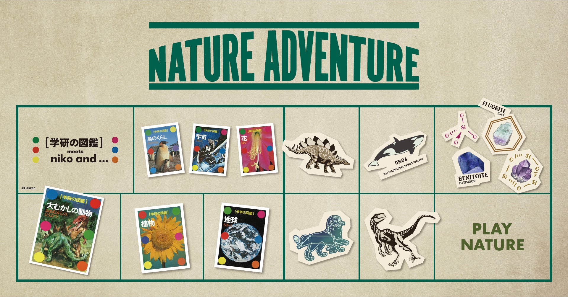 「niko and ...」は、ブランドが掲げる“uni9ue senses”(衣・食・住・遊・知・健・旅・音・LOCAL)の9つの要素を通して、ユニークなモノやコトを提案する企画を展開しています。今回は、「NATURE ADVENTURE ユーモアのある目線で自然の偉大さを楽しもう!」をテーマに、「学研の図鑑」とコラボレーションしたアイテムと、「niko and ...」オリジナルアイテムを展開します。
