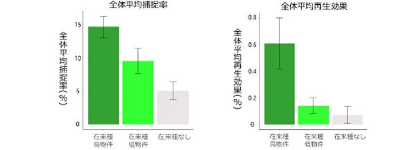 今回の調査では、在来種の植栽率が高いほど捕捉率と再生効果が高いことが確認できました。在来種の植栽率が50%以上の在来種高物件(30物件)においては、在来種の植栽率が30%以下の在来種低物件(5物件)や在来種が植栽されていない物件(5物件)(※11)と比較して捕捉率が1.1~3倍、再生効果が3倍以上となりました。(※12)