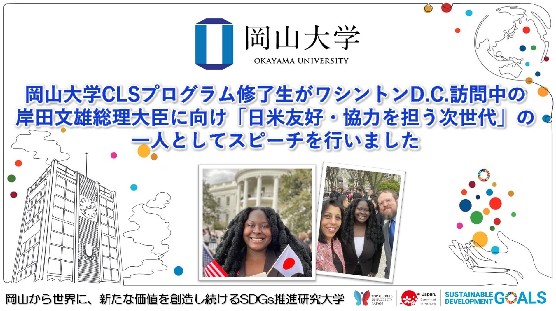 【岡山大学】岡山大学CLSプログラム修了生がワシントンD.C.訪問中の岸田文雄総理大臣に向け「日米友好・協力を担う次世代」の一人としてスピーチを行いました