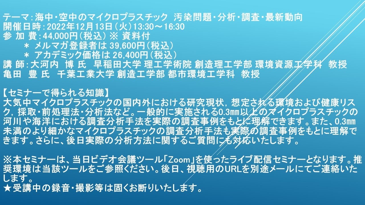 【ライブ配信セミナー】海中・空中のマイクロプラスチック 汚染問題・分析・調査・最新動向 12月13日(火)開催 主催:(株)シーエムシー・リサーチ