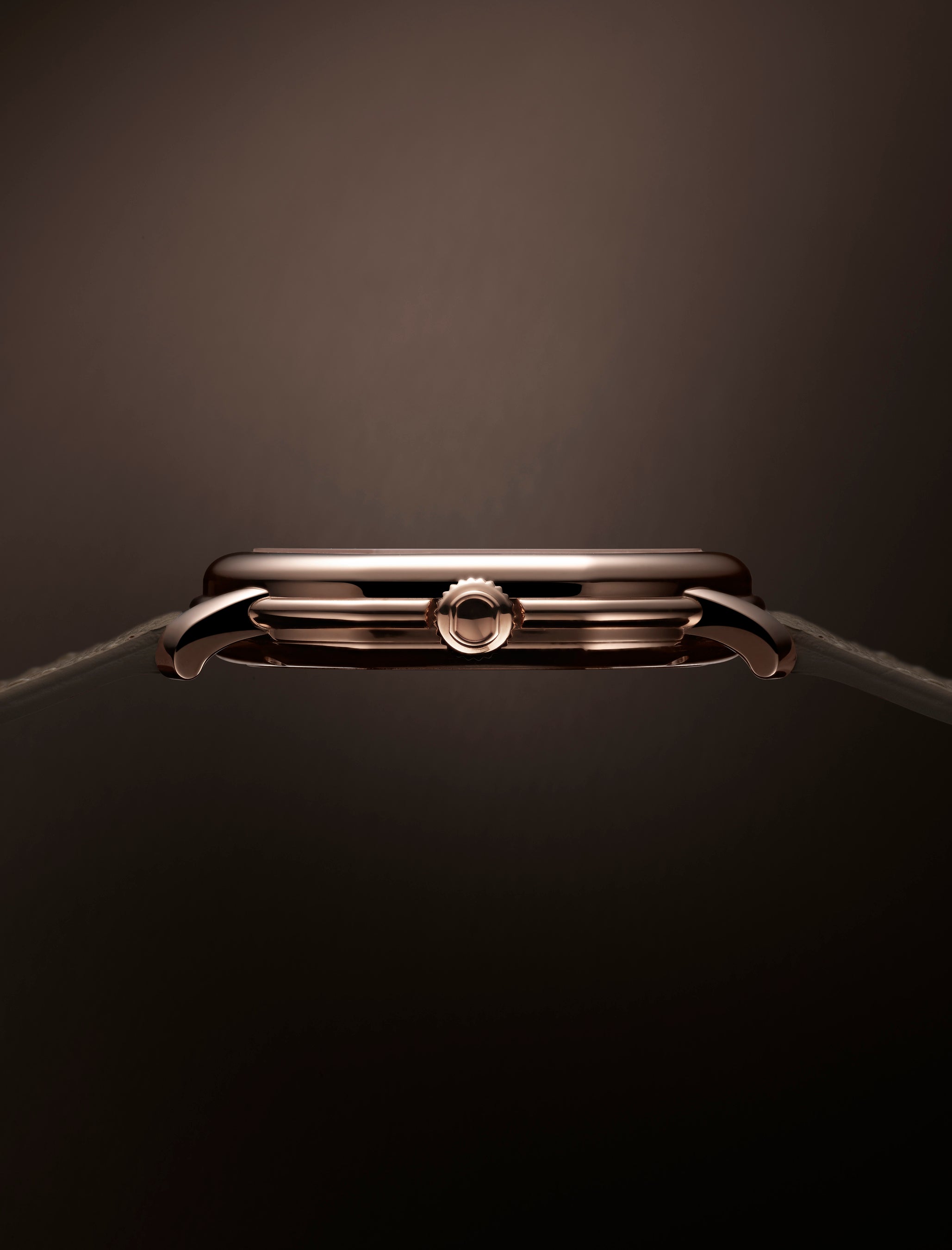 5Nローズゴールドのケースは、オリジナルデザインを尊重しながらも、アイコニックなダブルエリプスのシルエットを保ち、中央にひだ装飾を施して均整の取れたバランスを実現。より緩やかなカーブと下向きのアングルに再設計されたラグは、より快適なフィット感をもたらします。