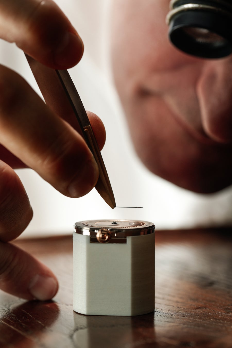 ケースは、伝統的な時計製造方法に従って組み立てられます。各ラグは、別々の部品として作られたのち、1つずつ、手作業で入念にケースにはんだ付けされます。ダイアル上の針は、ブラックコーティング加工を施したステンレススティール製で、ブラックのローマ数字や個別のウォッチ製造番号と調和しています。