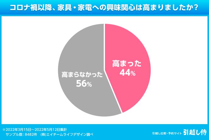 「高まらなかった」という人が56%と多数派ではあるものの、かなり多くの人が新型コロナウイルス感染症の感染拡大をきっかけに、インテリアに興味を持ち始めていることがわかります。
