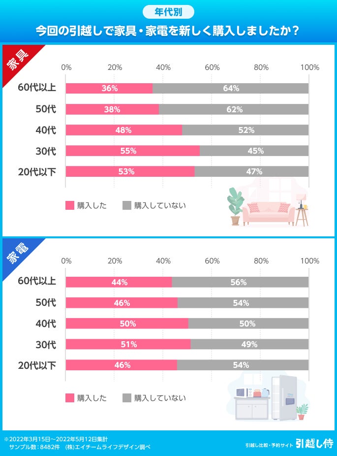 家具も家電も、「今回の引越しで新しく購入した」という人は48%、「購入していない」人は52%と、ほぼ半々となりました。