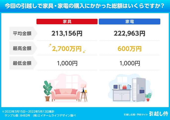 今回の引越しの家具や家電の購入総額の平均は、どちらもそれぞれ約20万円程度。100万円を超えた人は3%以上おり、最高額は家具で2,700万円、家電で600万円だった。